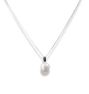 A classic pearl necklace with a freshwater pearl on a silver chain.