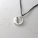 New Embrace necklace soft, organic shapes. The black leather strap creates a nice contrast and makes the necklace useful and flexible. Tie at desired length.