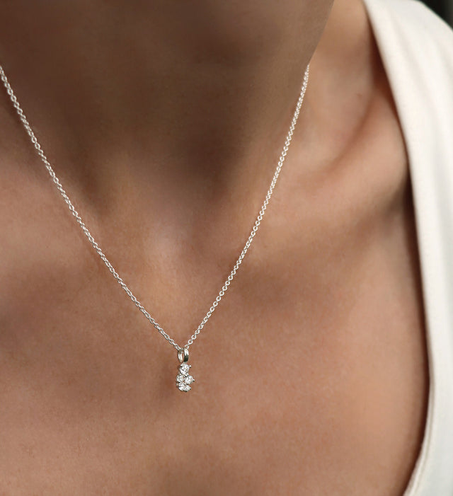 The discreet silver necklace with a small diamond is an everyday favorite that can easily be styled with more necklaces for the party.