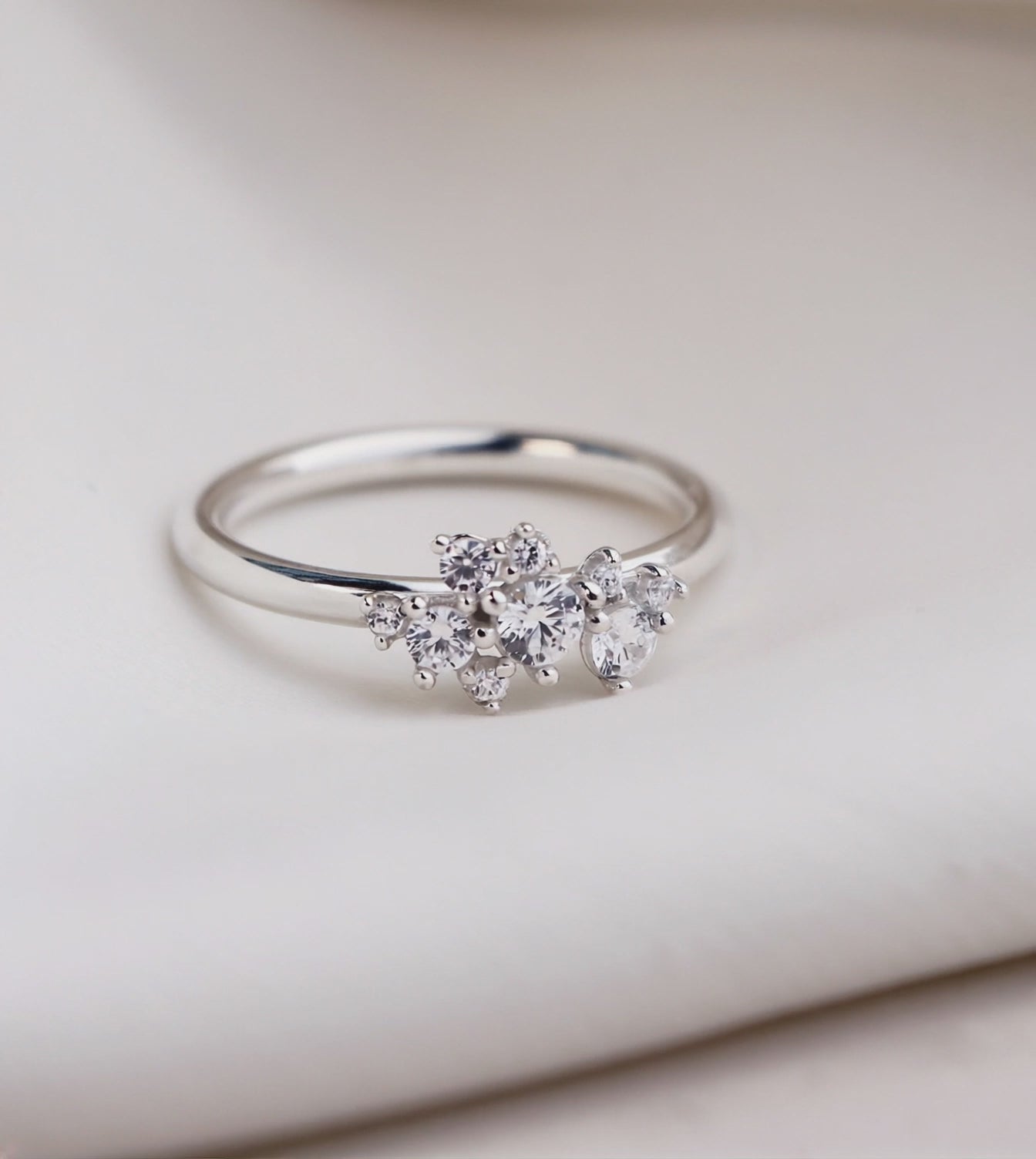 A beautiful diamond ring with a cluster of diamonds in different sizes. The diamonds are set irregularly with a nice flow.