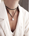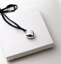 Necklace with a chunky silver heart on a black leather strap. The strap is made of soft, Swedish reindeer leather and is 1 meter long. Tie the necklace to the desired length, as a short choker necklace or as a longer necklace.
