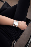 Armbandets utskurna hål på sidorna ger armbandet karaktär och framhäver din handled. Armbandets rundade ändar gör det bekvämt att ta av och på och att bära.